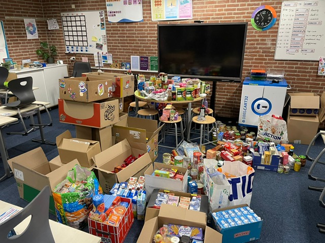 Het idee was dat kinderen kerstpakketten zouden samenstellen voor gezinnen die klant zijn bij de voedselbank. Maar er kwamen zóveel producten binnen dat het project letterlijk uit de klauwen liep. “Op één school hebben we twee keer met een vrachtwagen gereden. In totaal hadden we drie